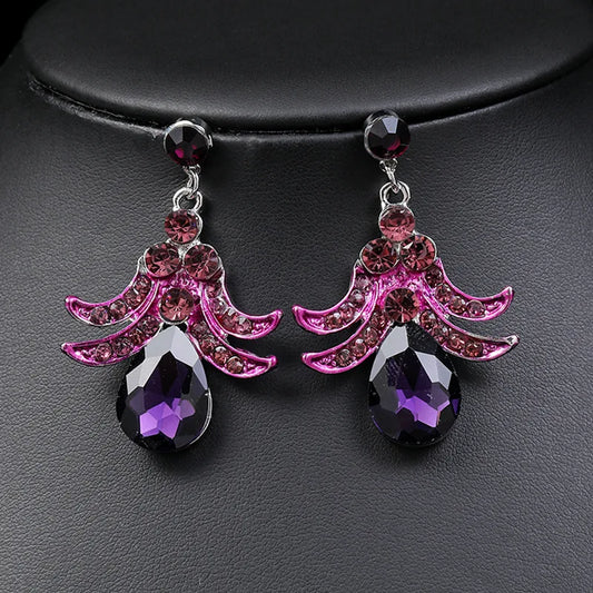 Purple Jewelry Set Wholesale Wedding Accessories Luxury Crystal Rhinestone Flower Statement Earrings and Necklace for Women